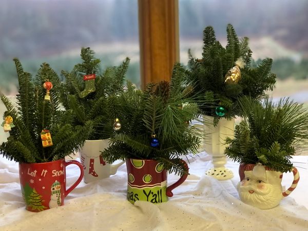Selection of natural greenery displayed in a large assortment of baskets, containers, vases, and bowls. All decked out for the holidays and sure to delight any recipient!